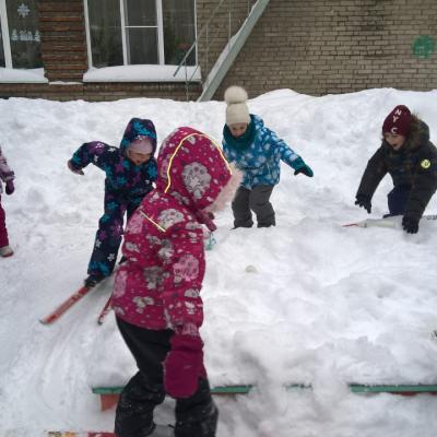 - Кто быстрее – участники на двух лыжах без палочек бегут до отметки и обратно к финишу (кто первый придёт, вручается жетон).